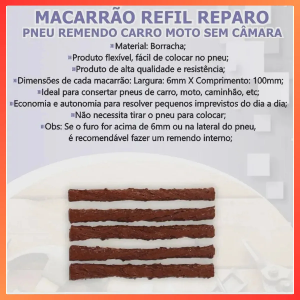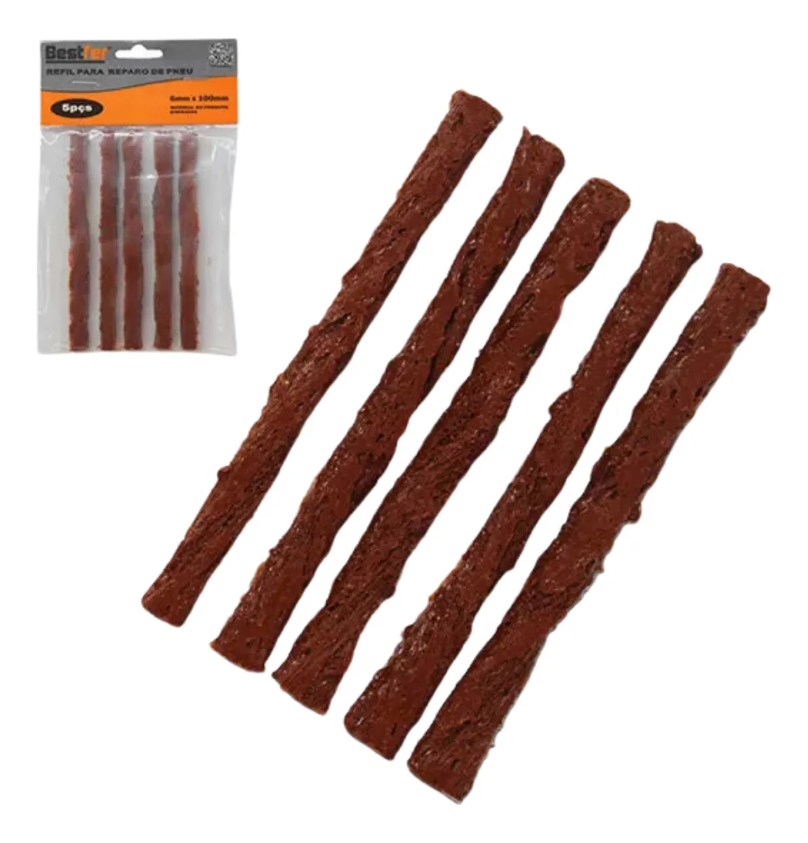 Refil Para Reparo De Pneu 5 Peças. Remendo Macarrão para reparar Pneus otimo para momentos de desespero e de emergencia. Recomendado usar com escariador e o aplicador do reparo com cola. Lave o local desejado escarie e aplique o remendo e a cola.